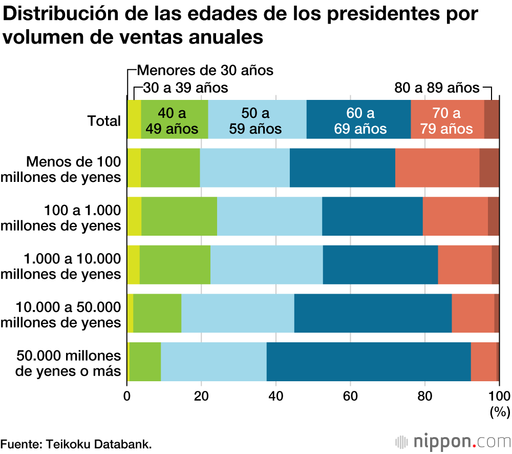 Si observamos la distribución de las edades de los presidentes por volumen de ventas anuales, encontramos que las empresas con más de 50.000 millones de yenes representan más del 80 % del grupo de 50 a 69 años de edad. Por otro lado, entre las empresas con menos de 100 millones de yenes el grupo de 50 a 69 años representa solo el 55 %, el de 70 a 79 años un 22,6 % y el de 80 años o más tiene el 5,4 %, cifras altas que destacan en comparación con las otras escalas de ventas anuales.