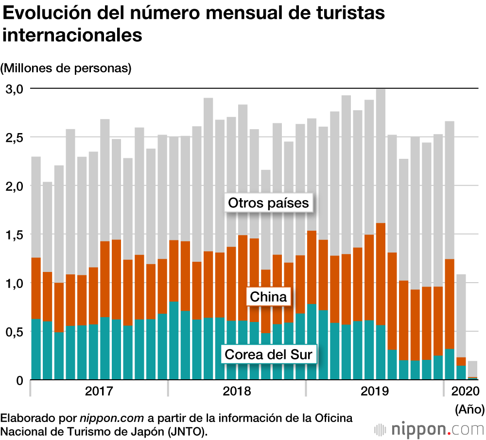 Datos de la Oficina Nacional de Turismo de Japón (JNTO, por sus siglas en inglés) revelan que el número de turistas internacionales se redujo un 93,0 % en marzo respecto al mismo mes del año anterior, con 193.700 personas. Esto se debe fundamentalmente a la expansión del nuevo coronavirus que provoca la enfermedad de la COVID-19, que ha obligado a muchos países a restringir los viajes al extranjero y a imponer medidas como el confinamiento de la población. En el caso concreto de Japón, el país reforzó las medidas de cuarentena e invalidó algunos visados. Aunque la afluencia de turismo extranjero ha experimentado una grave caída debido al nuevo coronavirus, la situación es similar a la de otros países en este aspecto.