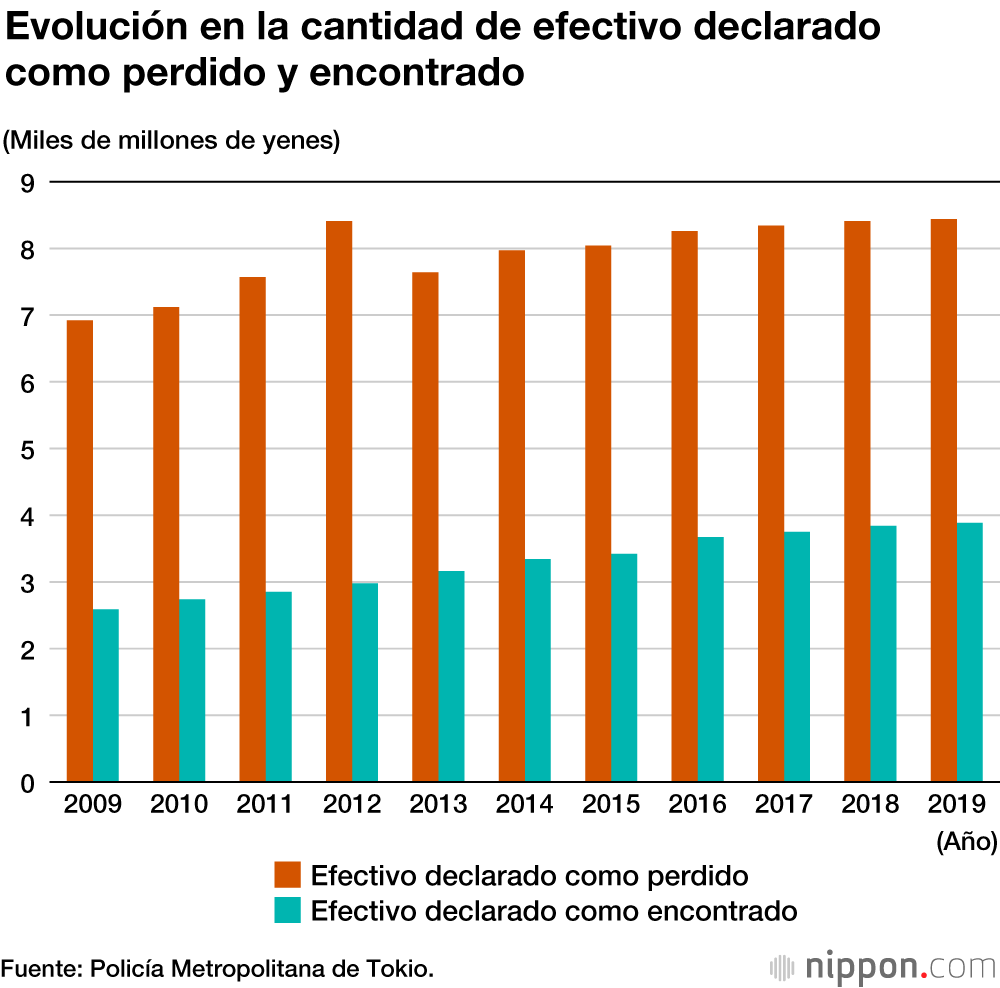 La cantidad de dinero entregado a la policía alcanzó una marca histórica por cuarto año consecutivo con 3.884.230.000 de yenes en efectivo, un 1,2 % más que el año anterior. Por otra parte, se denunció la pérdida de un total de 8.439.520.000 yenes, lo que significa que el 46,02 % del total extraviado fue entregado a la policía. En 2018, este porcentaje fue del 45,7 %. Aunque la vida en la gran capital tiene fama de ser un tanto inhumana, la moral de la gente parece mantenerse saludable.