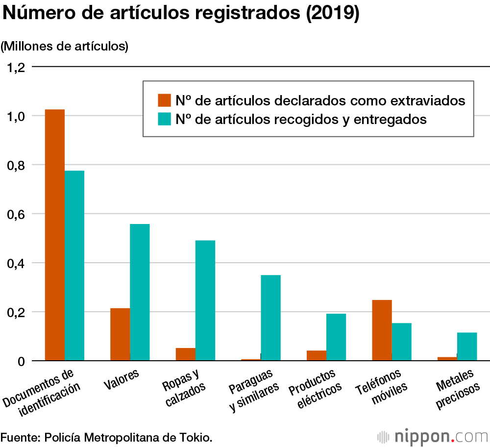 El número de artículos perdidos y olvidados denunciados a la policía aumentó un 0,8 % hasta 4.532.563. Los documentos de identificación, como las licencias de conducción y las tarjetas de crédito, fueron el objeto entregado en mayor número con el 17,1 % del total (774.697 artículos). Le sigue la categoría “valores”, donde se incluyen las tarjetas IC de transporte, los abonos y cupones de regalo, que representó el 12,3 % del total (557.614 artículos), “ropas y calzados” con el 10,8 % (490.571 artículos), “carteras” con el 8,2 % (371.890), y “paraguas” con el 7,7 % (349.287 artículos).
