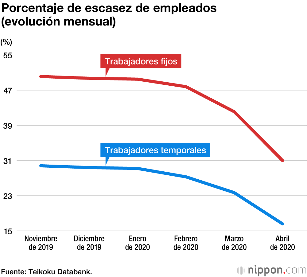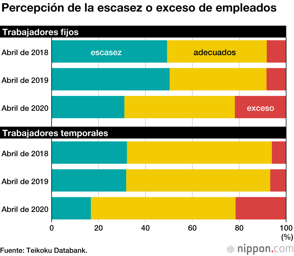 Una encuesta de Teikoku Databank sobre las tendencias en la escasez de mano de obra entre las empresas revela que, para abril de 2020, el 31 % de las firmas que participaron consideraban que sufrían una escasez de trabajadores fijos. Esto supone 19,3 puntos menos que el mismo mes del año anterior. Es la primera vez en cuatro años que un mes de abril registra menos del 40 %, lo que refleja una intempestiva caída en la necesidad de trabajadores. Casi la mitad, el 47,2 %, contestó que consideraba que tenía el número adecuado de trabajadores fijos. Finalmente, un 21,9 % dijo que pensaba que tenía más trabajadores fijos de los que necesitaba, lo que representa un aumento de 13,5 puntos con respecto al 2019.