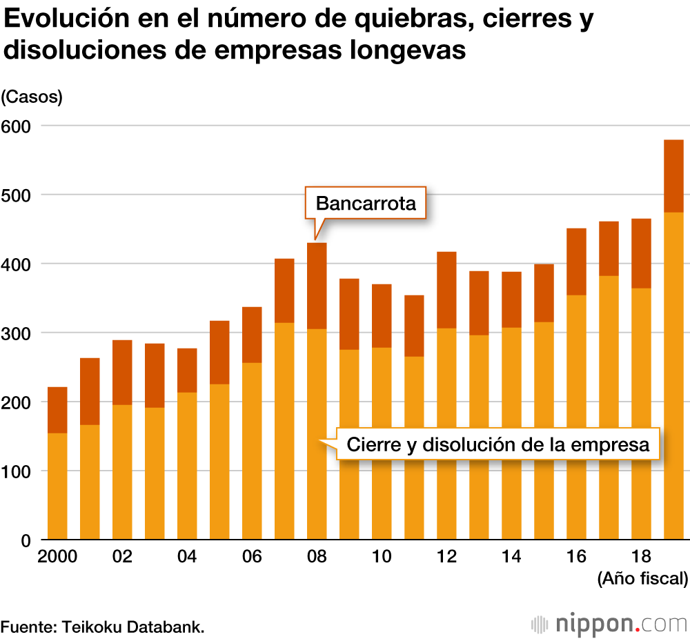 Según un estudio compilado por Teikoku Databank sobre las tendencias en materia de quiebras, cierres y disolución de empresas longevas que han estado en funcionamiento durante más de 100 años, en el año fiscal 2019 se registraron 579 quiebras, cierres y disoluciones (un 24,5 % más que el año anterior), y su número aumentó por quinto año consecutivo. Tanto el número de casos como el porcentaje de aumento fueron los más altos registrados en el pasado.