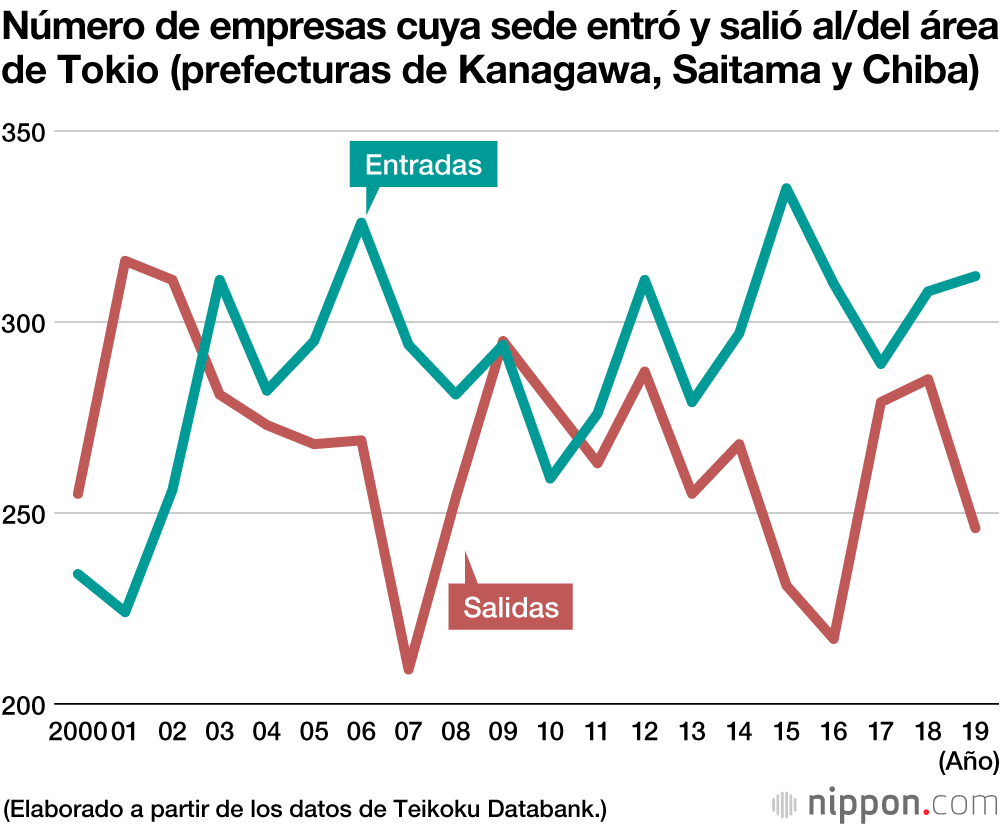 El número de exceso de entradas en 2019 aumentó en 43 empresas en comparación con el año anterior (23 empresas), lo que sugiere una mayor concentración de negocios en Tokio. Por otra parte, 126 empresas salieron y 161 se trasladaron al área de Osaka (prefecturas de Osaka, Kioto, Hyōgo y Nara). Fue el 29.º año consecutivo en el que se registró un exceso de salidas desde que comenzó el estudio en 1991.