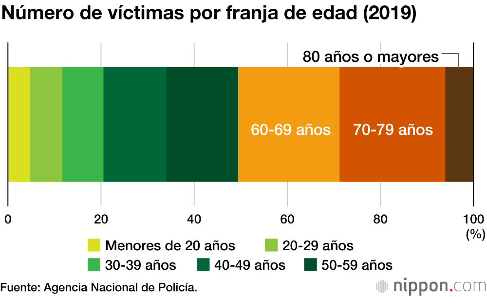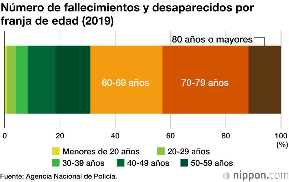 Si nos fijamos en el desglose por franjas de edad de las víctimas, la más numerosa fue la de 70-79 años (22,7 %), seguida por la de 60-69 años (21, 8 %) y la de 50-59 (15,4 %). Más del 70 % de los muertos y desaparecidos se encontraban entre las personas de 60 años o mayores, lo que hace que el número de accidentes en los que se ven envueltos los mayores sea llamativo.