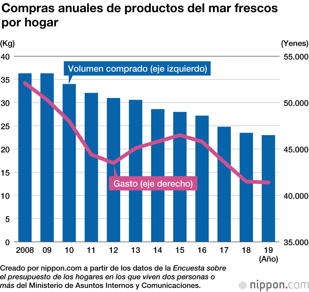 El volumen anual de productos del mar frescos que compra cada hogar está también experimentando un declive constante. De acuerdo con una encuesta del Ministerio de Asuntos Internos y Comunicaciones sobre los hogares con dos personas o más, en 2008 las familias compraron un promedio de 36,3 kilogramos de productos del mar frescos. No obstante, para 2019 la cantidad cayó hasta los 23 kilogramos.