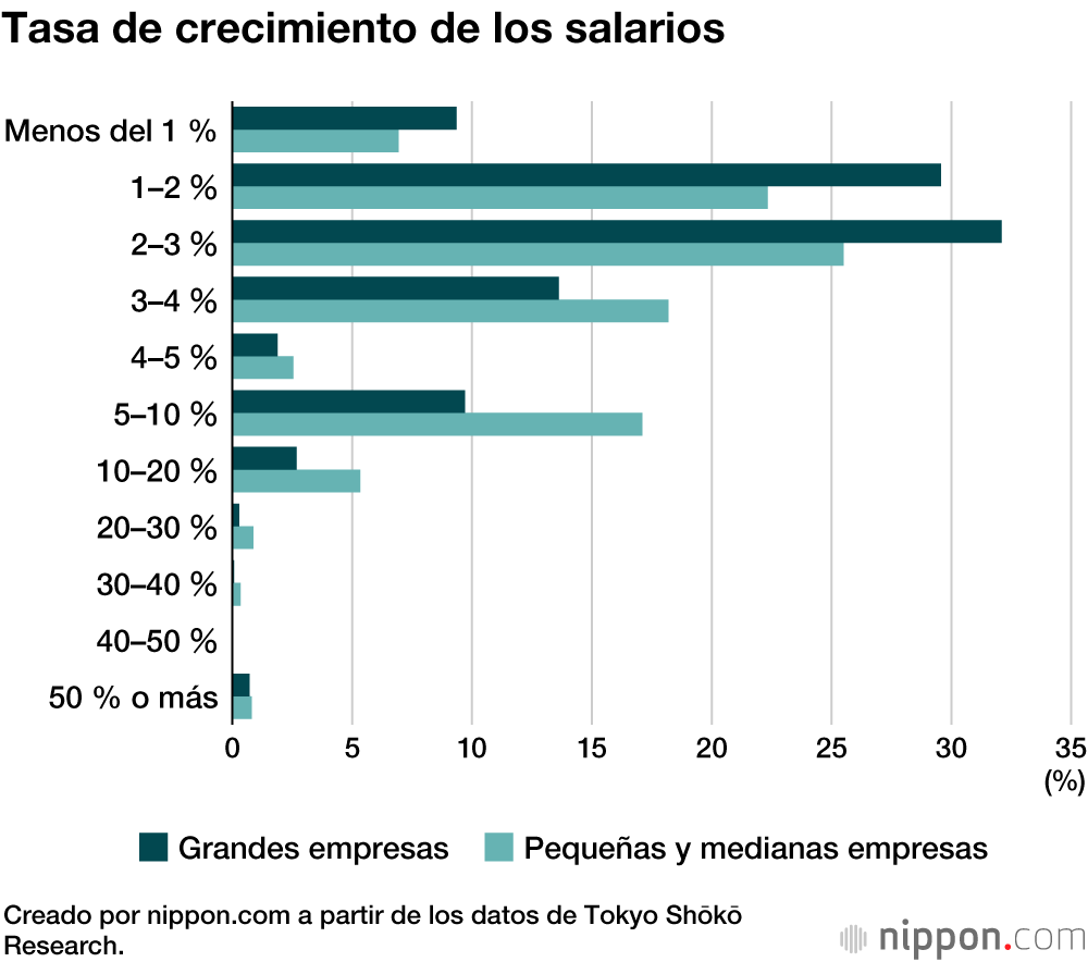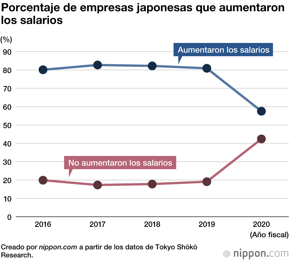 Una encuesta de Tokyo Shōkō Research realizada entre finales de junio y comienzos de julio en la que se preguntó a 13.870 empresas japonesas revela que el 57,5 % de ellas implementó o planeó aplicar un aumento salarial en el año fiscal 2020, lo que supone un descenso de 23,4 puntos porcentuales respecto al año anterior.