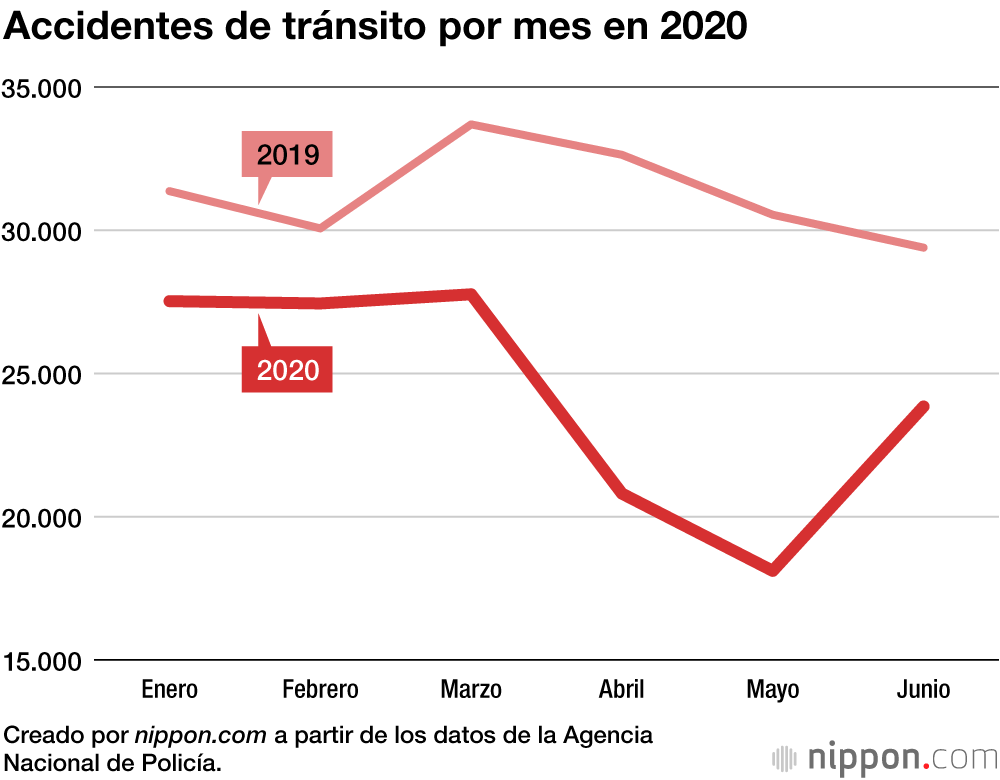 Entre enero y marzo hubo 27.000 accidentes cada mes, pero en abril, cuando el Gobierno de Japón declaró el estado de emergencia, esta cifra cayó en unos 7.000 hasta los 20.805. En mayo el número se redujo aún más hasta los 18.107 accidentes. Incluso en junio, después de que el Ejecutivo levantase el estado de emergencia, el número de accidentes solo aumentó hasta los 23.846. Los descensos interanuales en estos meses fueron del 36,2 %, el 40,7 % y el 18,9 %, respectivamente.