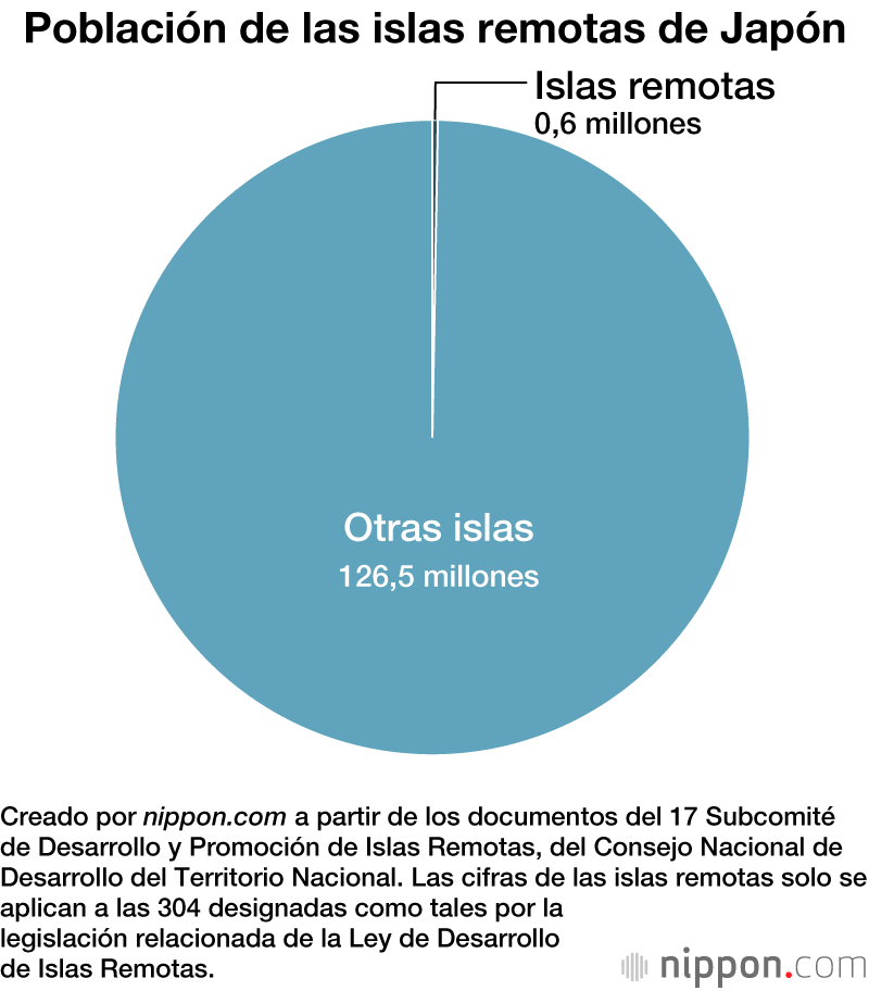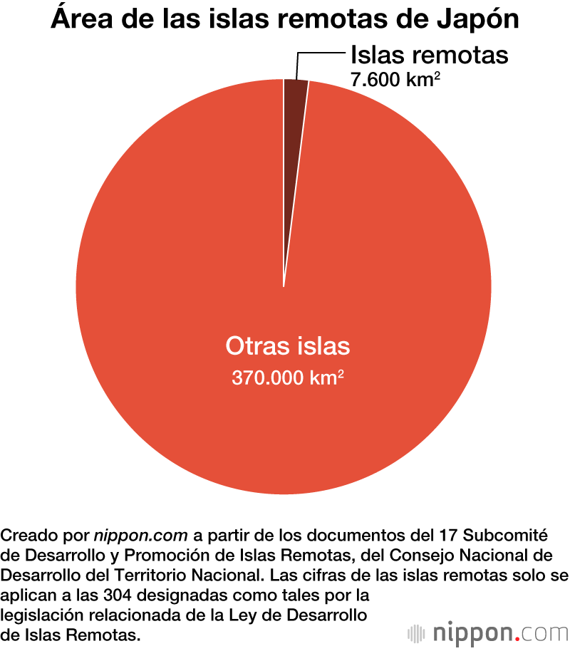 De las islas remotas habitadas, el área total de las 304 designadas por la legislación relacionada de la Ley de Desarrollo de Islas Remotas representa el 2 % del total de la masa terrestre de Japón, y solo el 0,5 % de la población nacional vive allí. Más del 70 % tiene 500 habitantes o menos.