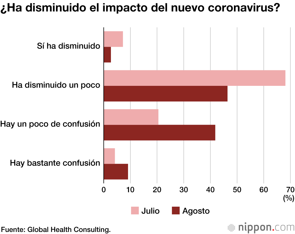 Una encuesta realizada en agosto a varios hospitales revela que, cuando el número de personas infectadas en todo el país comenzó a aumentar de nuevo, hubo un fuerte aumento de la confusión en la gestión hospitalaria. Cuando se les preguntó si el impacto del nuevo coronavirus había disminuido en la encuesta anterior de julio, el 24,7 % de los encuestados respondieron que estaban “Ligeramente confundidos” o “Bastante confundidos”. Esta cifra se duplicó hasta el 50,9 % en agosto.