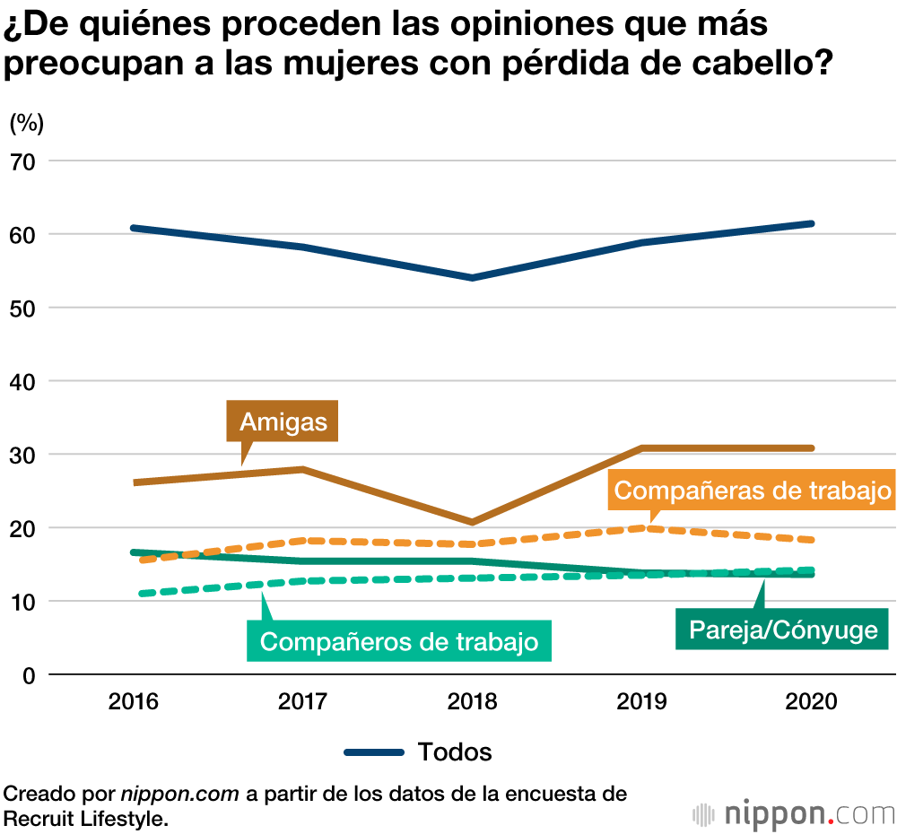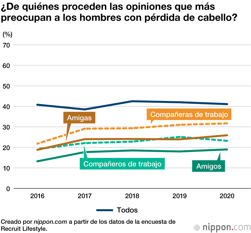 Una encuesta de la empresa Recruit Lifestyle, en la que se preguntó a 50.000 hombres y mujeres residentes en Japón con edades comprendidas entre los 20 y los 69 años, revela que un 7,8 % de las mujeres y un 26,7 % de los hombres han experimentado pérdida de cabello. Además, un 30 % tanto de hombres como de mujeres contestaron que aunque no han tenido ese problema aún, les angustia la posibilidad de sufrirlo en el futuro, y un 20 % afirmó que está tomando algún tipo de medida preventiva.