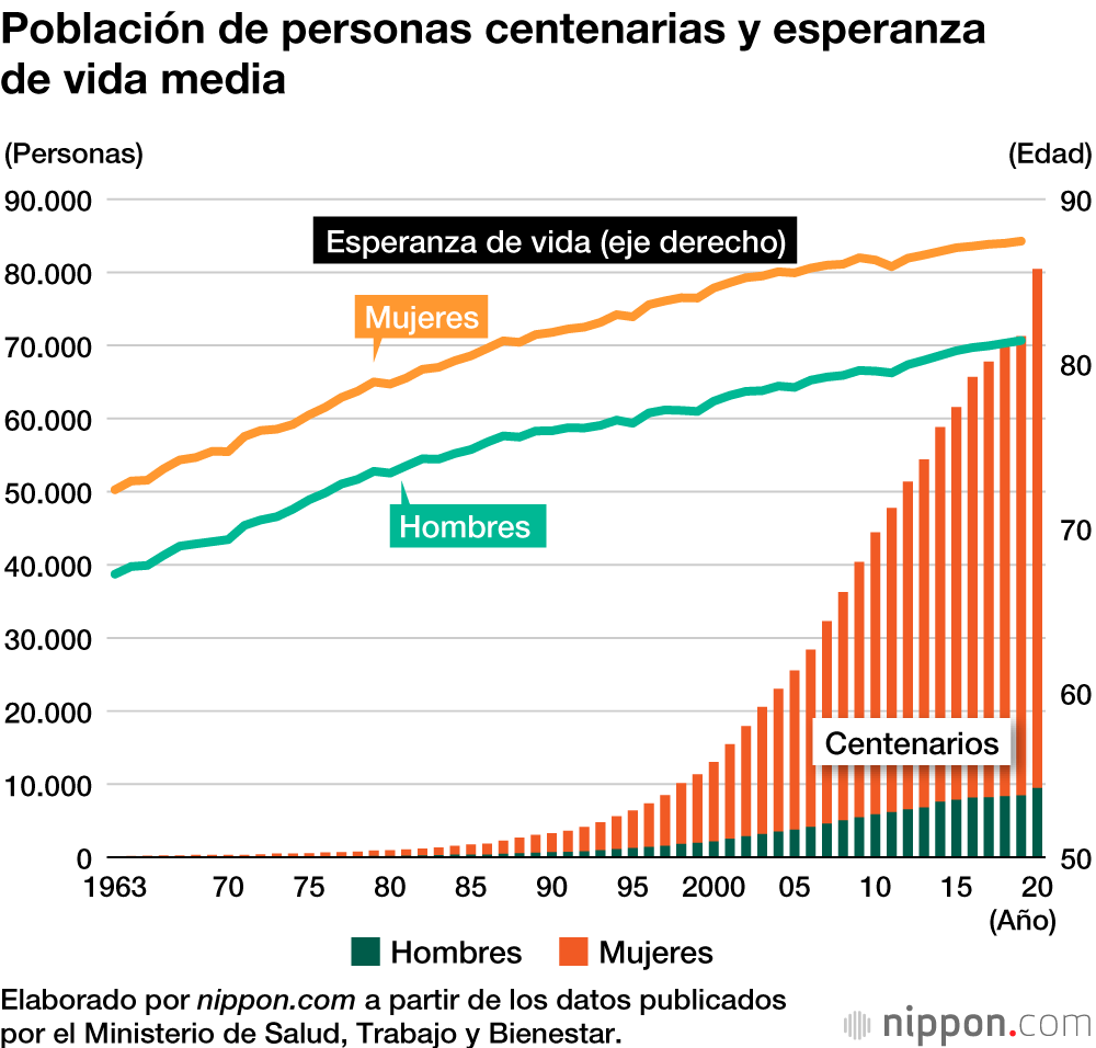 Hay 80.450 personas centenarias en Japón. El 15 de septiembre, el Ministerio de Salud, Trabajo y Bienestar anunció esta cifra total calculada a partir de los datos del registro de residentes a 1 de septiembre de 2020, que refleja un aumento de 9.176 personas respecto al año anterior. Es la primera vez que se supera la marca de las 80.000 personas de 100 años o más. Japón, un país conocido por su alta esperanza de vida, ha experimentado un aumento paulatino de su población centenaria en los últimos 50 años. Las mujeres representan además una mayoría de las personas centenarias con un 88,2 % del total.