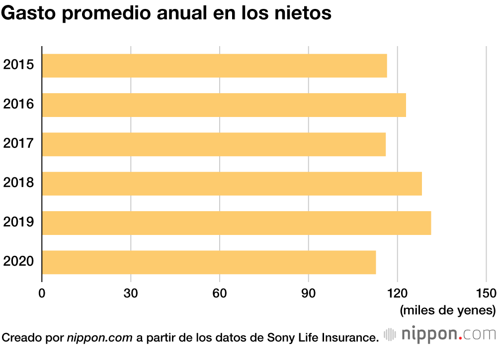 Una encuesta reciente sobre el estilo de vida de las personas de edad avanzada en Japón revela que en el pasado año la cantidad promedio que los abuelos y abuelas gastaron en sus nietos fue 112.715 yenes. Este estudio, realizado anualmente por la empresa Sony Life Insurance, también reveló que la cantidad total más frecuente rondó entre los 50.000 y los 100.000 yenes, con un 27,1 % de las personas encuestadas. El gasto en los nietos ha aumentado de forma constante hasta 2019. No obstante, en 2020 cayó notablemente en comparación con el año anterior en unos 18.619 yenes. Sony Life Insurance sugiere que, además de no haber podido ver a sus nietos con la frecuencia habitual debido a la COVID-19, el aumento del impuesto al consumo en octubre de 2019 también podría haber tenido un efecto significativo.
