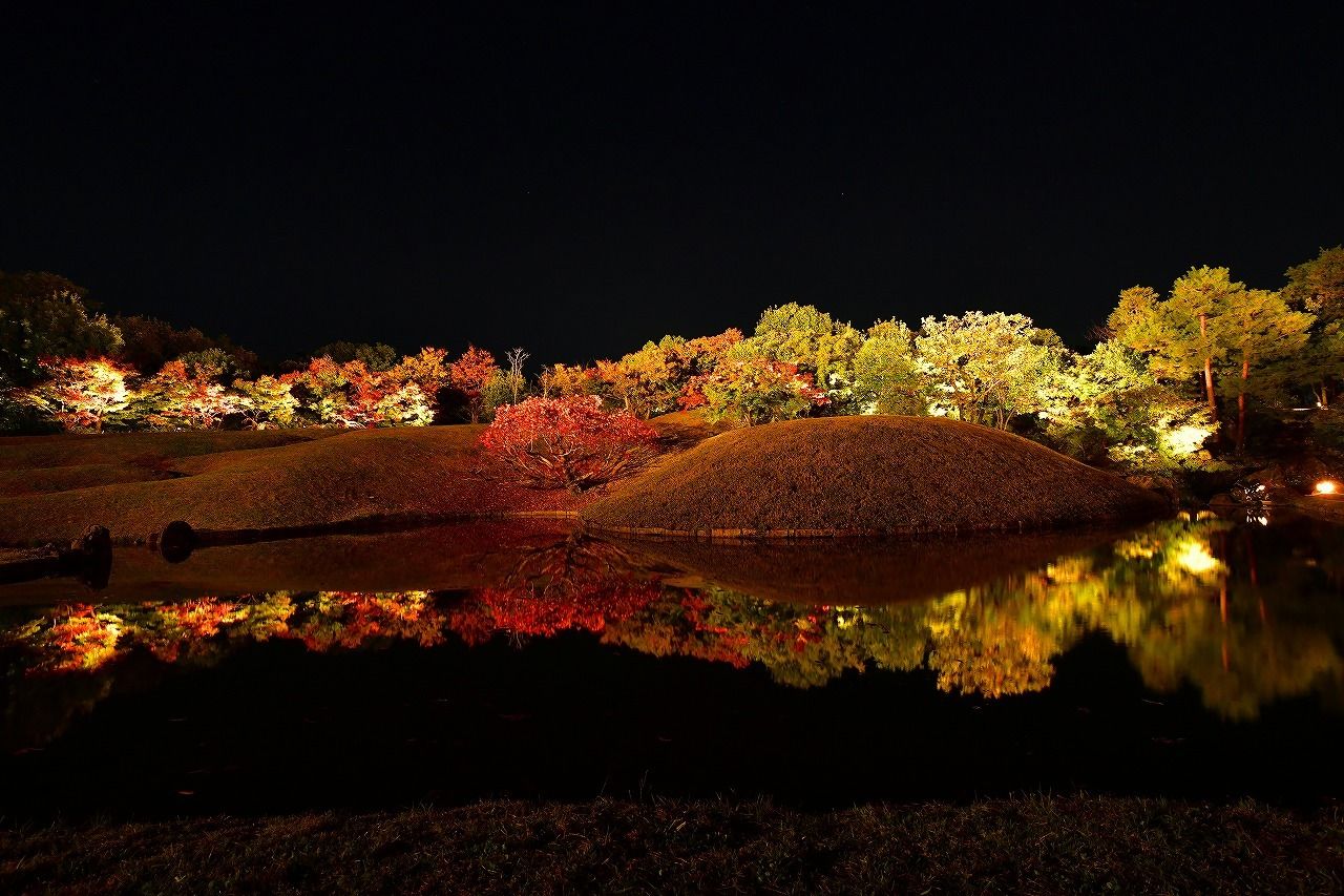 Alrededor del estanque hay unos 100 arces japoneses que lo dotan de color. La principal atracción es la belleza de las hojas otoñales reflejadas en la superficie del estanque. La singular técnica aplicada en el estanque, que dispone solo un centímetro de agua sobre el granito negro, crea una vista sorprendentemente clara de las hojas.