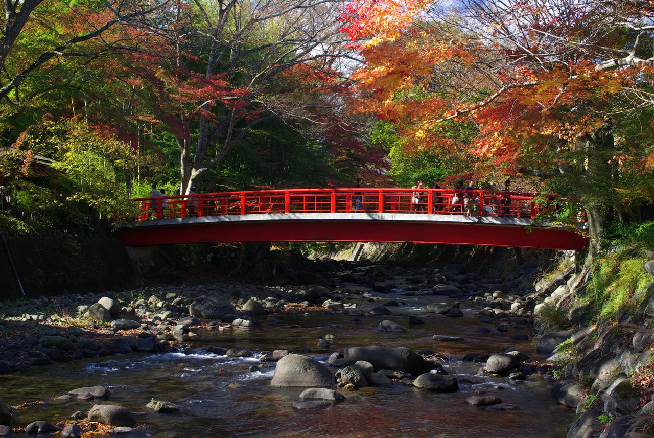 Shuzenji es conocido como el centro termal más antiguo de Izu. Al puente Katsura se le llama cariñosamente “El puente de los nexos”. La barandilla pintada de bermellón se confunde con los colores de las hojas de otoño creando una atmósfera romántica.