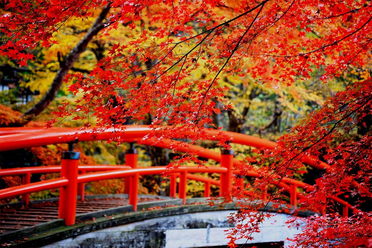 El puente arqueado rojo más allá del santuario de Ikaho hace juego con las hojas otoñales. En 2020, el follaje estará iluminado por la noche desde el martes 27 de octubre hasta el domingo 15 de noviembre.
