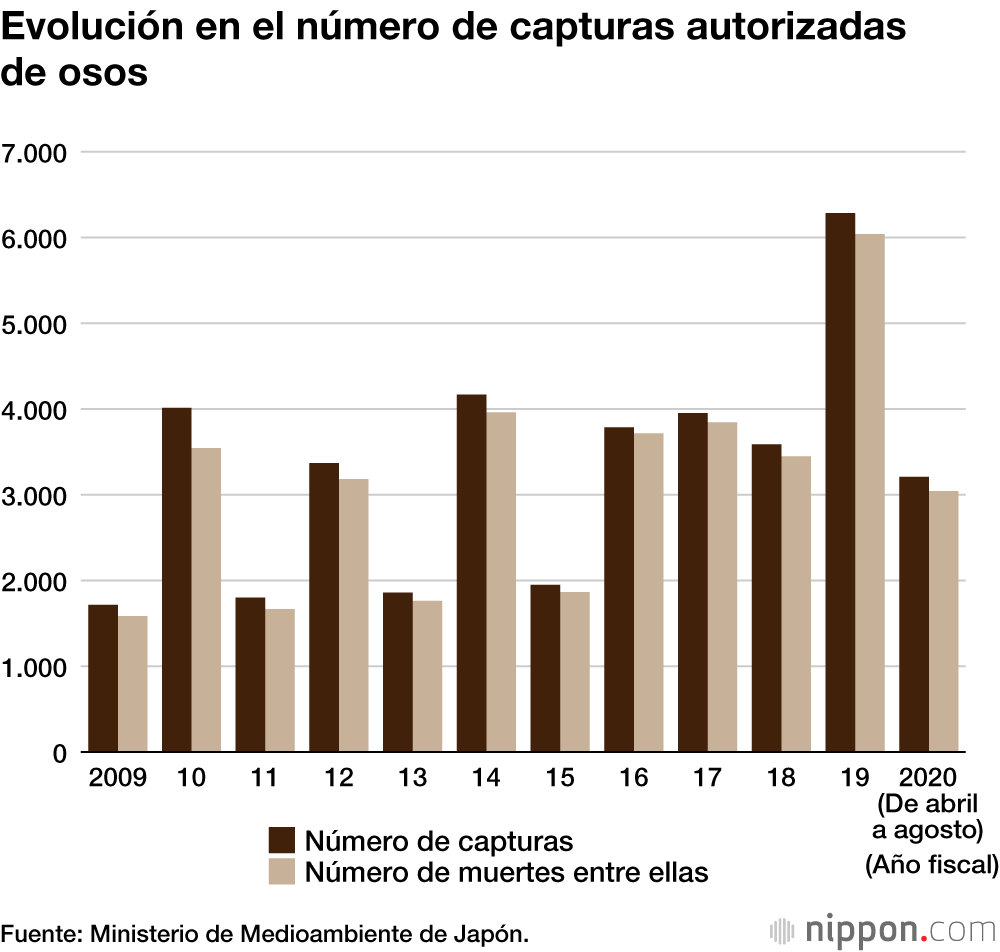 El número de osos capturados en el año fiscal 2019 (el número de capturas aprobadas por el gobernador de la prefectura y otras autoridades) aumentó en un 75,2 % con respecto al año anterior (3.586 osos) hasta alcanzar los 6.285 osos. En el año fiscal 2020 el número de capturas continúa en la misma tendencia. En los cinco meses hasta finales de agosto ya se habían registrado 3.207 casos.