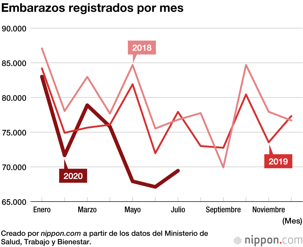 En mayo, durante el período del estado de emergencia en Japón, se notificaron en los municipios 67.919 embarazos. Esto supuso un 17,1 % menos que el año anterior. El número de embarazos registrados ha continuado reduciéndose respecto al año anterior, con 67.115 en junio (un 5,4 % menos) y 69.448 en julio (un 10,9 % menos). En el período comprendido entre enero y julio de 2020, la cifra total de notificaciones de embarazo se redujo en un 5,1 % respecto al año anterior hasta las 513.850.