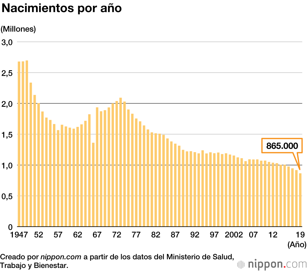 Durante el primer baby boom (1947-1949) hubo más de 2,5 millones de alumbramientos en Japón, y más de 2 millones en el segundo (1971-1974). Esa cifra ha ido decreciendo paulatinamente desde entonces. En 2007 Japón registró más muertes que nacimientos en un año por primera vez. Los niños del segundo baby boom tienen ahora más de 40 años y ya no se encuentran en la edad en la que se suelen tener hijos, por lo que se espera que el declive continúe avanzando y ahora en mayor medida a causa de la pandemia.