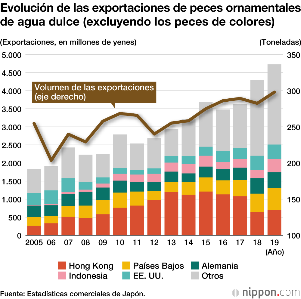 No fue hasta la primera década del 2000 que las exportaciones comenzaron a despegar. Ante la menguada demanda interna, surgieron estrategias de venta a personas adineradas en el extranjero que resultaron un éxito. El monto total de las exportaciones de peces ornamentales de agua dulce (excluyendo los peces de colores) llegó a calcularse en 4.720 millones de yenes en 2019, lo que supone dos veces y media más que lo registrado en 2005, hace 15 años. El principal destino de las exportaciones (en términos de valor) en 2019 fue Hong Kong, con 700 millones, seguido de los Países Bajos, Alemania e Indonesia.