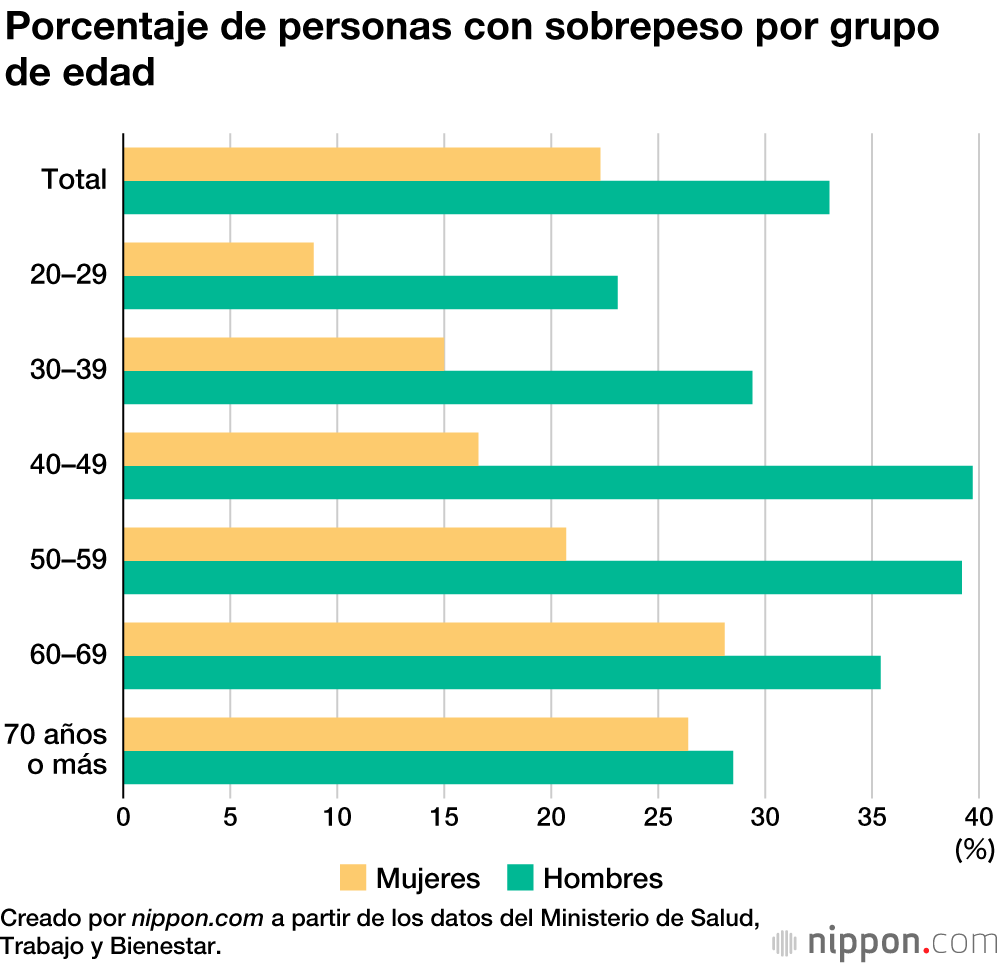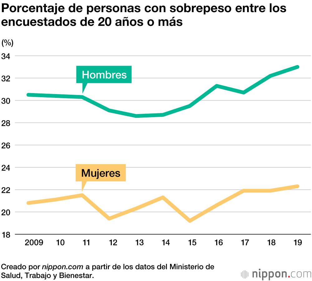 La encuesta anual sobre salud y nutrición nacional en Japón, realizada por el Ministerio de Salud, Trabajo y Bienestar, revela que la obesidad masculina ha continuado creciendo desde 2013. Los resultados de 2019 sugieren que el 33,0 % de los hombres tienen sobrepeso dado su índice de masa corporal promedio de 25 o más, 4,4 puntos superior al de 2013. El promedio de personas con sobrepeso era del 39,7 % entre los hombres de entre 40 y 49 años y del 39,2 % en aquellos de entre 50 y 59 años. En cuanto a las mujeres, el promedio total fue del 22,3 %, 2,0 puntos porcentuales más que en 2013. Hay una proporción menor de mujeres obesas en comparación con los hombres en todos los grupos de edad.