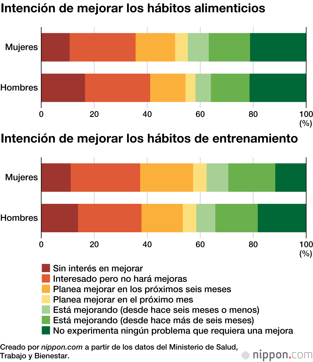 El porcentaje de hombres y mujeres que no mostraron interés o intención de mejorar sus hábitos alimenticios y de entrenamiento aumentó entre el 30 % y el 40 %. De acuerdo con las respuestas ofrecidas por los encuestados, lo que les impide con más frecuencia mejorar sus hábitos son responsabilidades como el trabajo, las tareas del hogar y el cuidado de los hijos. Algunos encuestados también confesaron que no había una razón en particular o simplemente afirmaron que era muy “fastidioso”.