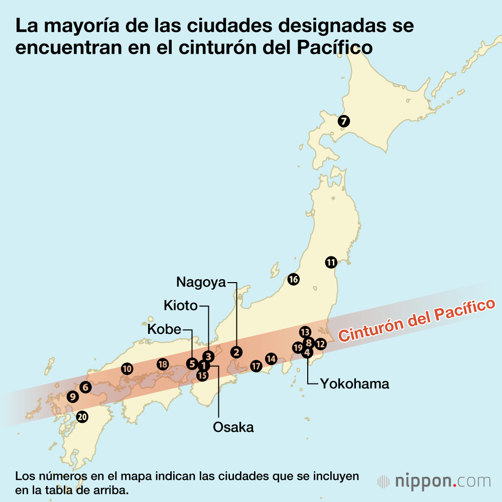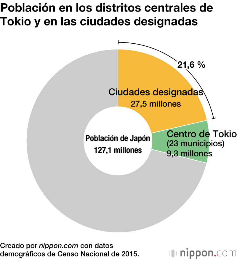 Creado por nippon.com con datos demográficos de Censo Nacional de 2015. Las ciudades marcadas en color tienen una población de un millón de habitantes o más.