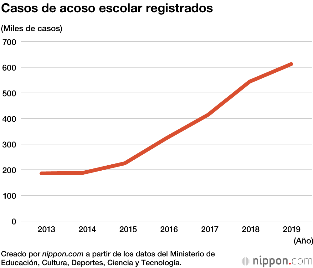 Los casos de acoso escolar reportados aumentaron en 2019 en las escuelas de primaria, secundaria e instituto públicas y privadas de Japón respecto al año anterior, con 68.563 casos más y un total de 612.496. Estos resultados se desprenden del Estudio sobre Comportamientos Problemáticos y Absentismo en los Centros Educativos realizado por el Ministerio de Educación, Cultura, Deportes, Ciencia y Tecnología.