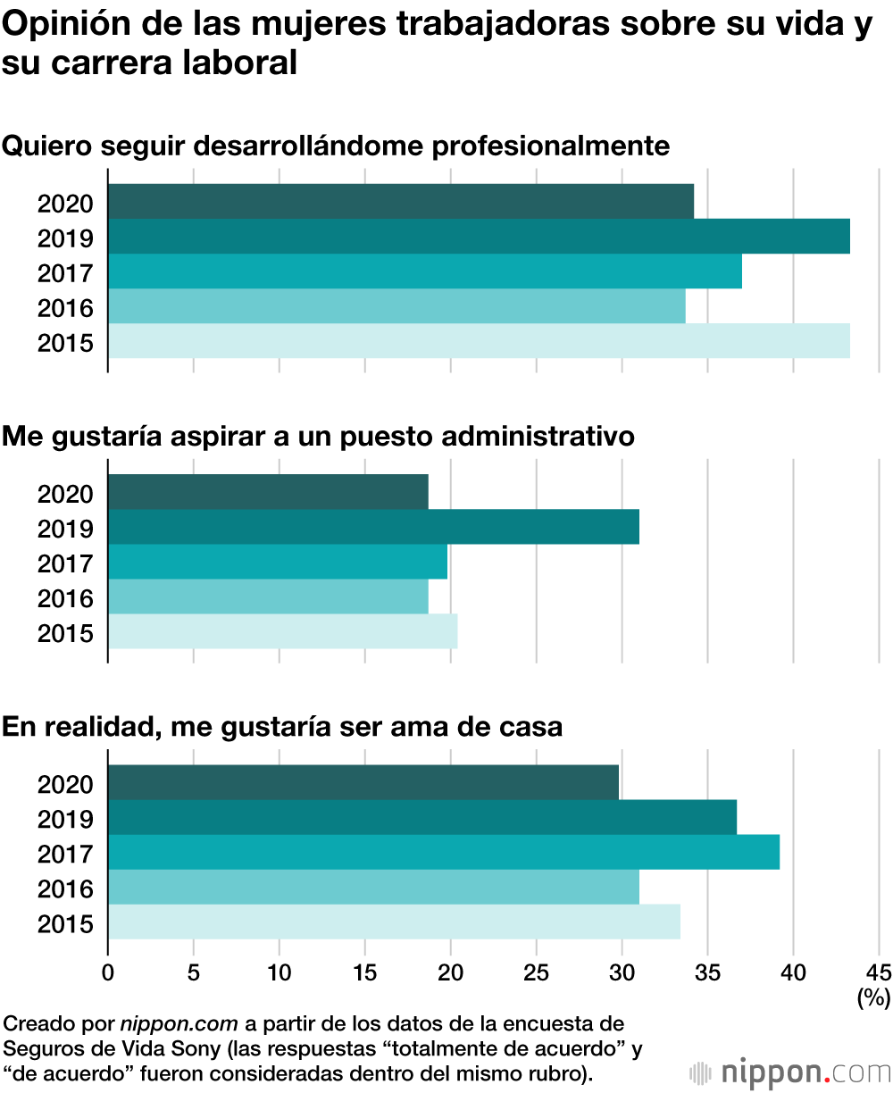 En contraste, el 66,8 % de las mujeres que cuentan con un empleo consideró que las trabajadoras se enfrentan a muchas desventajas en la vida laboral. Con respecto al tipo de apoyo que las mujeres esperan recibir de sus empleadores, el 20 % dijo que desearía un sistema de horarios laborales reducidos de acuerdo a la edad de sus hijos; el 18,7 %, subsidios relacionados con la crianza; el 17,7 %, la eliminación de largos horarios de trabajo y el 15,8 %, un sistema que permitiera trabajar desde casa.