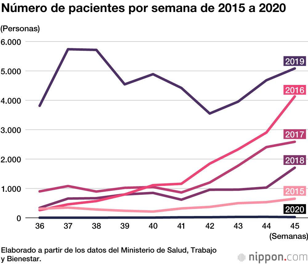 Los brotes de gripe varían de un año a otro, con un amplio rango en el número de casos. Si observamos el número de casos en las semanas 36.ª a 45.ª por temporada, en la más reciente (2019-2020), que comenzó el año pasado, se superaron los 3.000 desde el comienzo del recuento y llegó a la marca de 5.000 en la siguiente semana, la 37.ª. Por el contrario, en la temporada 2015-2016, que comenzó en 2015, el número de casos se mantuvo casi por debajo de 500, e incluso en la 45.ª semana fue de 650.