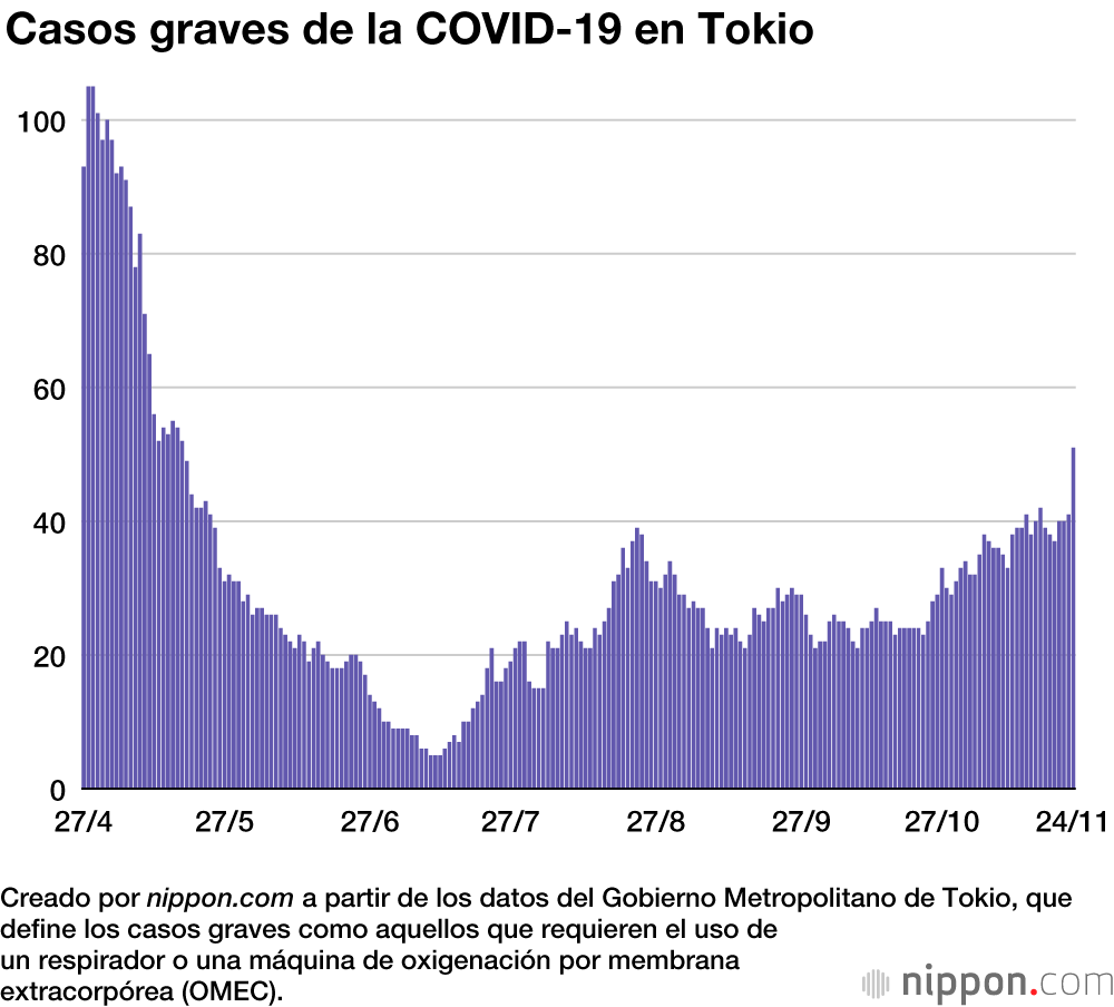 El 24 de noviembre se confirmaron 51 casos graves en Tokio, 10 más que el día anterior. Es la mayor cifra registrada en la capital desde que se levantara el estado de emergencia el 25 de mayo.