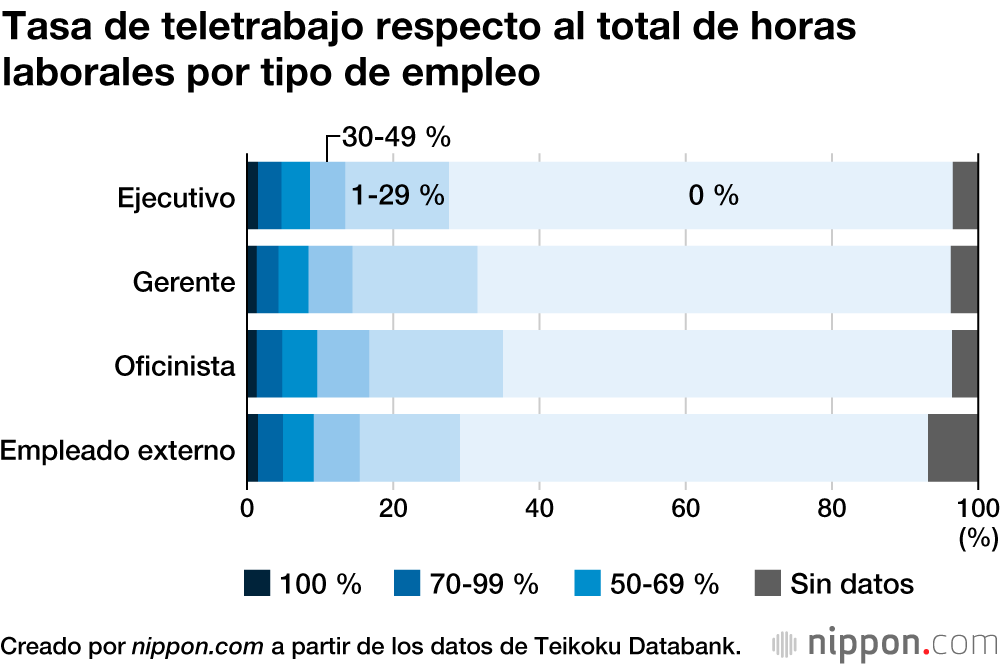 Una encuesta realizada a empresas de todo Japón reveló que el índice de trabajo remoto entre todas las horas laborales se mantiene en un promedio de entre el 10 % y el 20 %. La entidad a cargo de este estudio, Teikoku Databank, encuestó a 23.707 empresas y recibió 11.003 respuestas válidas.