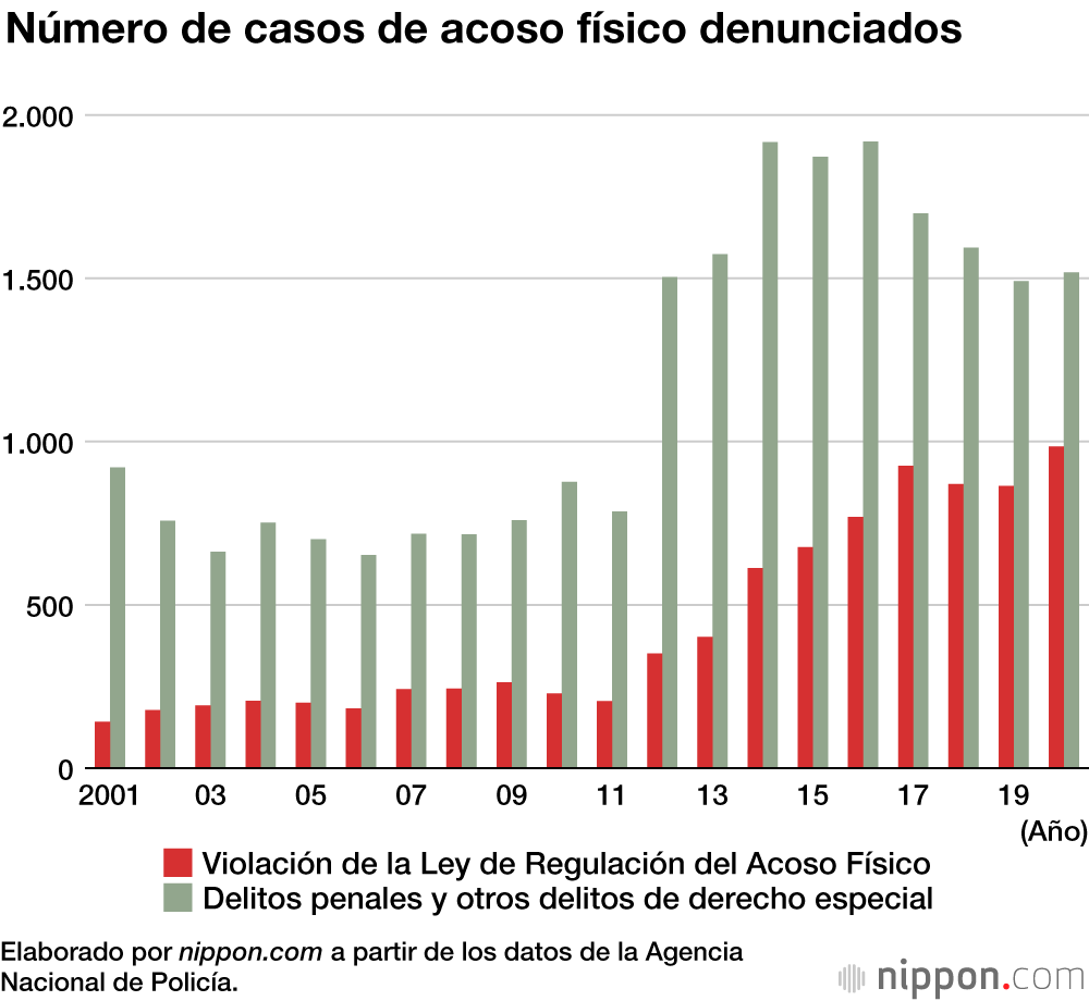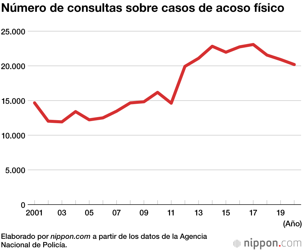 Según un estudio de la Agencia Nacional de Policía, el número de consultas que las víctimas de acoso físico realizaron en 2020 se redujo en 723 casos respecto al año anterior, situándose en 20.189 casos. Aunque el número ha disminuido, la cifra total sigue siendo elevada. Este es el octavo año consecutivo que se superan los 20.000 casos. El número de infracciones de la ley contra el acoso físico alcanzó la cifra récord de 985, 121 más que el año anterior.