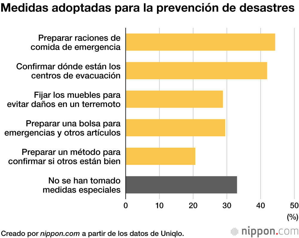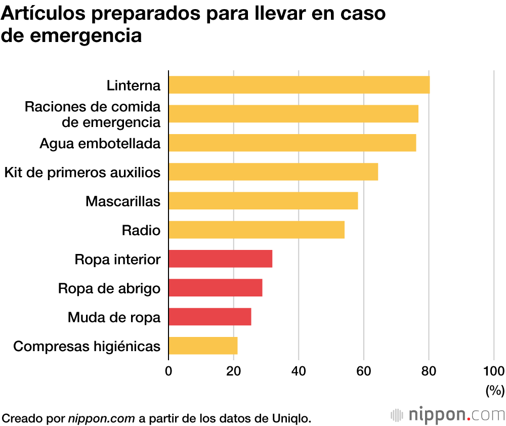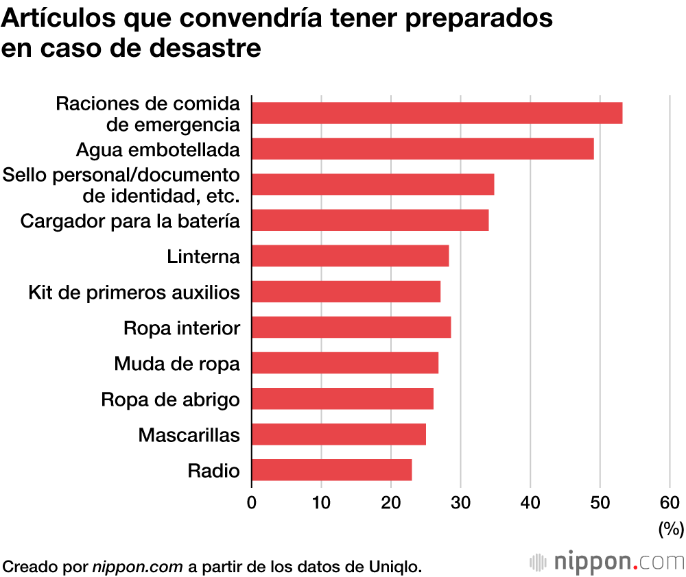 Una encuesta de Uniqlo sobre la preparación ante emergencias, en la que se preguntó a 2.400 personas de edades comprendidas entre los 20 y los 69 años, reveló que el 47 % de los que respondieron tenían “siempre” o “a menudo” presente la posibilidad de que ocurriera un desastre natural, un porcentaje que llega al 86,2 % si se incluye a aquellos que piensan en este tipo de sucesos cuando llega la época del año en la que suelen ocurrir o cuando se publican noticias al respecto.