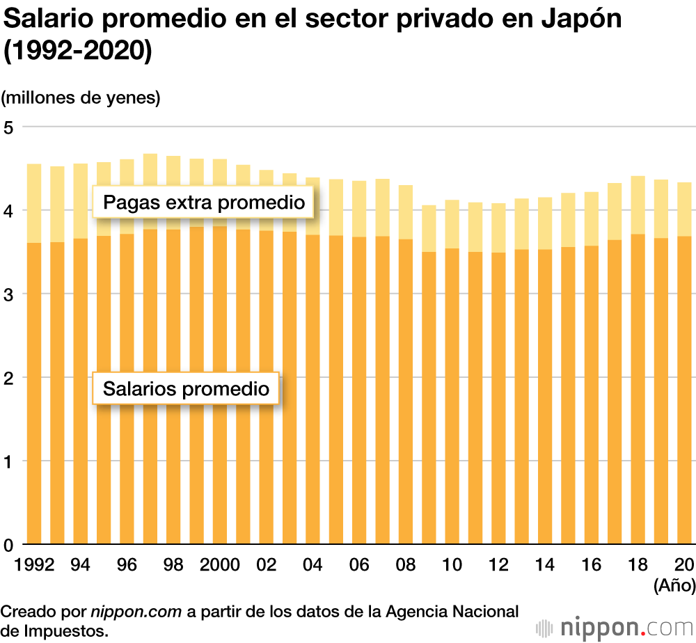 De acuerdo con una encuesta de la Agencia Nacional de Impuestos sobre los salarios en el sector privado, la remuneración promedio anual en 2020 cayó un 0,8 % respecto al año anterior hasta los 4.331.000 yenes (unos 38.000 dólares). Es el segundo año que se registra un descenso.