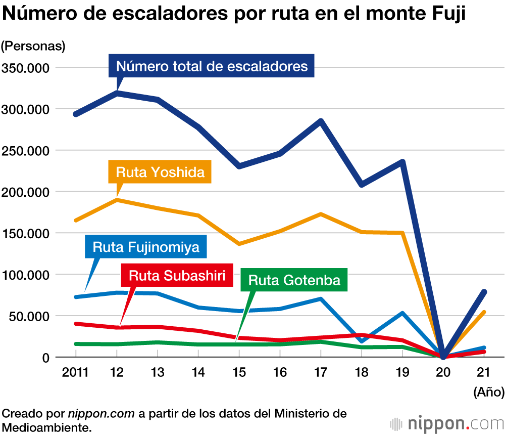 Desde 2005, el ministerio registra el número de escaladores instalando contadores de infrarrojos cerca de la octava estación de cada una de las cuatro rutas: Yoshida, Subashiri, Gotemba y Fujinomiya. El mayor número de escaladores se registró en la ruta Yoshida, con 54.392, un poco menos del 40 % que en 2019. Le siguieron Fujinomiya (11.409), Subashiri (6.411) y Gotemba (6.336).