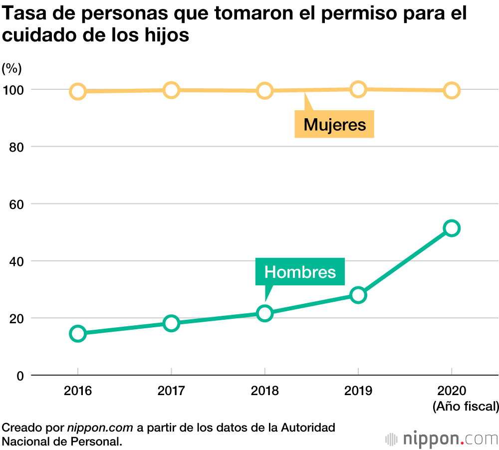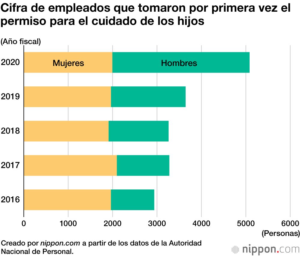 De acuerdo con un informe de la Autoridad Nacional de Personal (Jinjiin), 5.084 funcionarios nacionales en Japón que trabajan en puestos generales se acogieron al permiso para el cuidado de los hijos en el año fiscal 2020. Hubo un incremento general de 1.441 personas que tomaron esta baja en comparación con el año 2019 y, entre ellas, 1.411 fueron hombres. Además, la tasa de hombres que pidió la baja creció en 23,4 puntos porcentuales respecto al 28,0 % de 2019, hasta el 51,4 % en 2020, con lo que se superó la barrera del 50 % por primera vez.