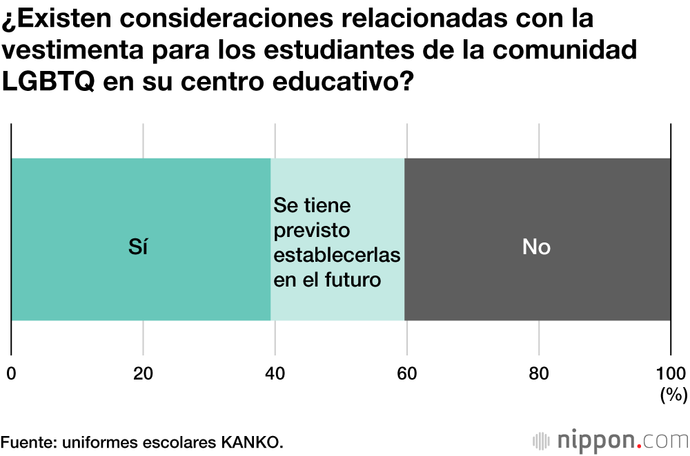 En el mundo de los uniformes escolares, donde antiguamente se estableció el estilo marinero para las niñas y el cuello levantado para los niños, se ha empezado a extender rápidamente una perspectiva libre de género. La empresa de uniformes escolares KANKO, con sede en Okayama, encuestó a 1.800 profesores de escuelas primarias, secundarias e institutos de todo el país para averiguar si en sus centros educativos se tenían en cuenta las cuestiones relacionadas con la vestimenta para los estudiantes que pertenecen a la comunidad LGBTQ(*1). El 39,3 % respondió que sí, mientras que el 20,3 % dijo que en la actualidad no hay ninguna medida concreta, pero tienen previsto abordar la cuestión. Es decir que cerca del 60 % de las escuelas e institutos en Japón cuentan con disposiciones relacionadas con la vestimenta o prevén establecerlas.