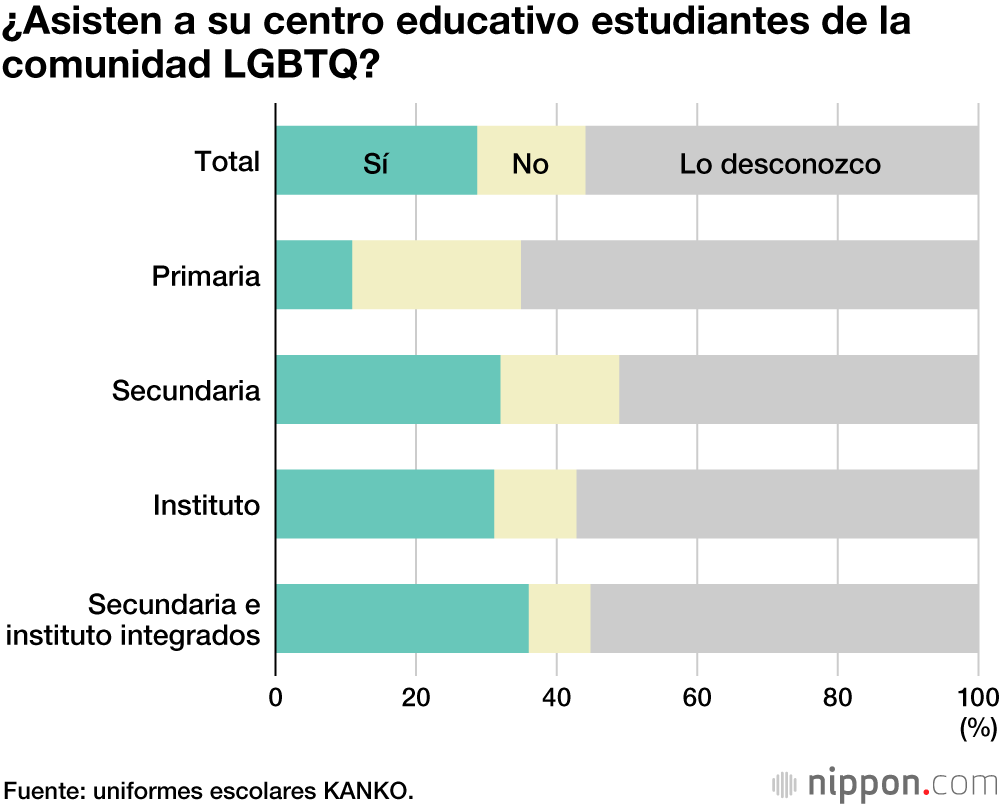 Con respecto a si están al tanto de los estudiantes de la comunidad LGBTQ que asisten a sus centros educativos, el 10,9 % de los profesores de primaria dijo que sí, mientras que el 32 % de los de secundaria, el 31,1 % de los de instituto y el 36 % de los de secundaria e instituto integrados respondió de la misma manera.