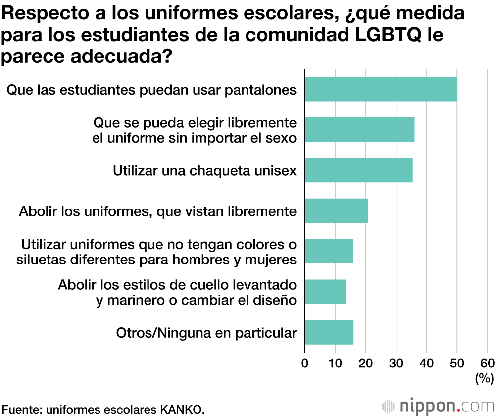 Acerca de qué medida para los estudiantes de la comunidad LGBTQ les parece más adecuada con respecto a los uniformes escolares, la mayoría, el 50,1 %, dijo que los pantalones para las chicas, mientras que el 36 % contestó que los estudiantes puedan elegir si quieren llevar falda o pantalón y lazo o corbata sin importar su sexo y el 35,4 % el uso de una chaqueta unisex.