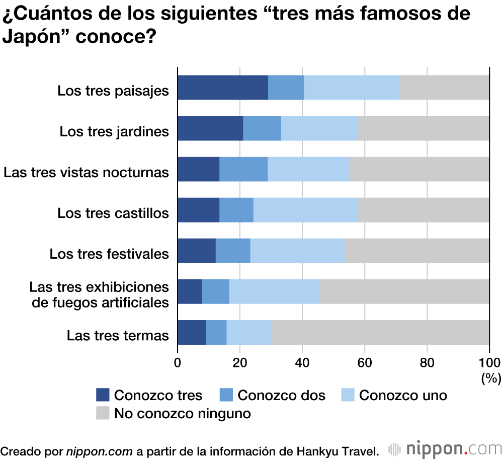 Los tres paisajes más famosos de Japón son, según la idea más extendida, los elegidos en el periodo Edo (1603-1868) por el filósofo confucianista Hayashi Gahō (Shunsai): Miyajima, en la prefectura de Hiroshima, Amanohashidate, en la prefectura de Kioto y Matsushima, en la prefectura de Miyagi. El 11,5 % de los encuestados dijo conocer dos de ellos, mientras que el 30,5 %, solo uno. En total, más del 70 % recuerda al menos uno, mientras que el 29 %, ninguno.