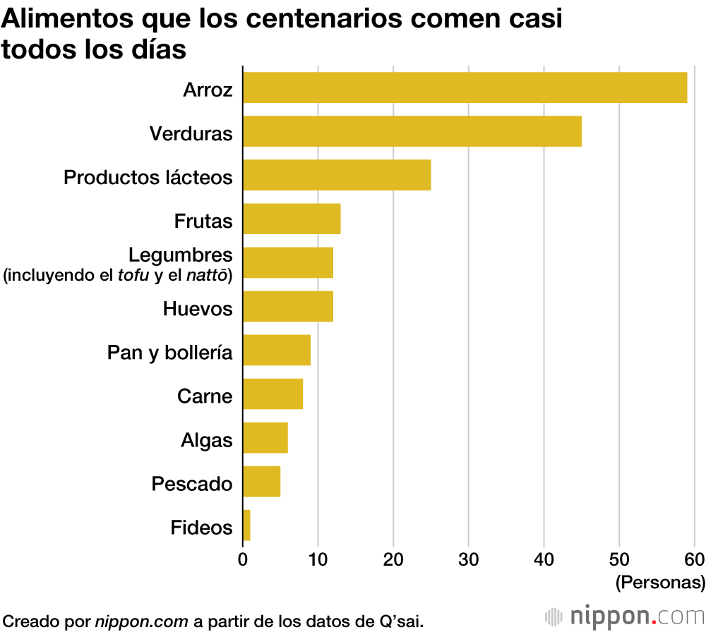 Los tres alimentos más consumidos casi a diario por los centenarios sanos son el arroz (59 personas), las verduras (45) y los productos lácteos (25). Muchos de ellos tienen el hábito de ingerir lo que su cuerpo necesita: el arroz para obtener energía, las verduras para las vitaminas y minerales, y los productos lácteos para el calcio que fortalece huesos y dientes.