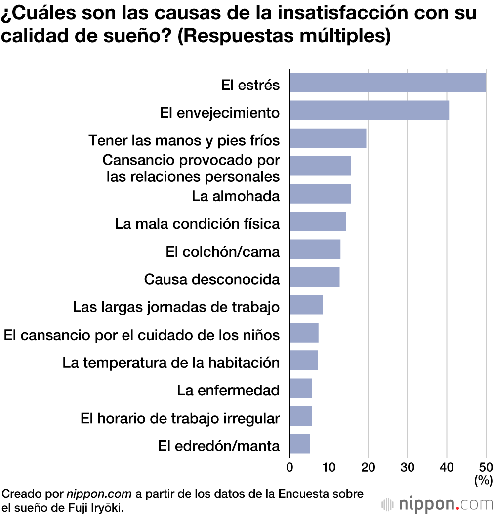 En una encuesta realizada entre 4.519 personas de todo Japón por la empresa Fuji Iryōki, que fabrica y vende sillones de masaje y otros aparatos sanitarios y tiene sede en la ciudad de Osaka, el 93,9 % afirmó que a veces se siente insatisfecho con la calidad de su sueño. Las quejas más comunes fueron: “No me siento descansado ni siquiera después de haber dormido” (18,0 %), “me despierto muchas veces” (14,6 %) y “tengo que ir al baño con demasiada frecuencia” (11,6 %).