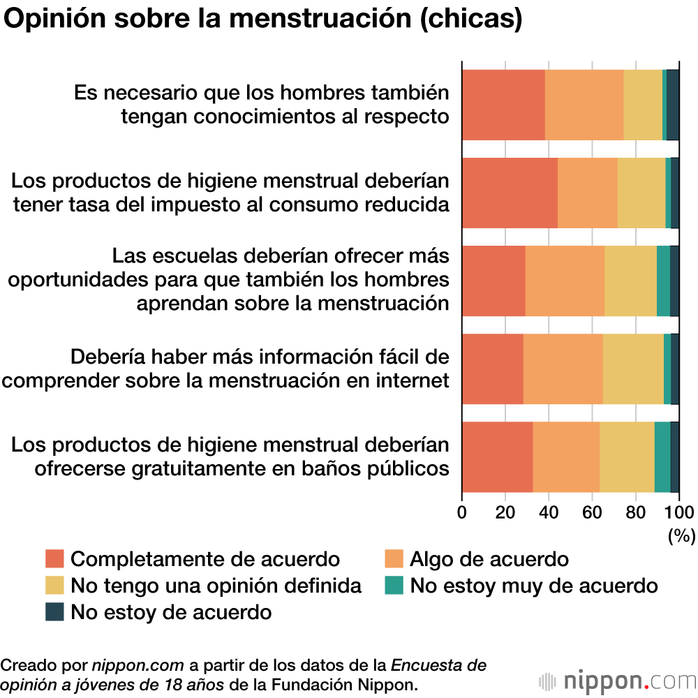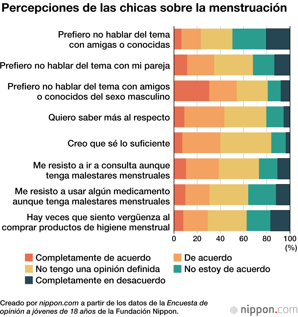 La Fundación Nippon realizó la encuesta vía internet a mil jóvenes japoneses de ambos sexos de entre 17 y 19 años de todo el país. Los resultados revelaron que el 40 % de las chicas y solo el 17,8 % de los chicos creen que tienen suficientes conocimientos sobre la menstruación.