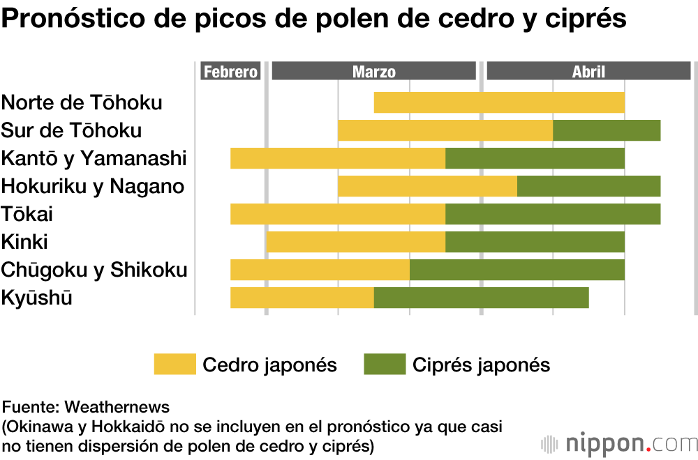 Se pronostica que el polen de cedro siga volando en Kyūshū y las zonas de Chūgoku y Shikoku hasta mediados de marzo, y en las zonas de Kantō y Tōkai hasta finales de marzo, seguido del polen de ciprés hasta mediados de abril.