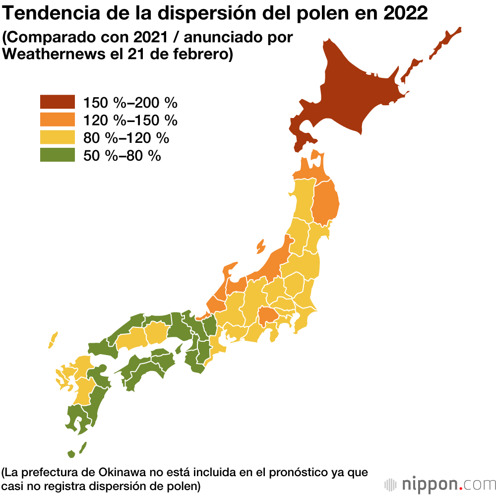 En 2022, se espera que la cantidad de polen dispersado sea un 80 % mayor que en 2021 en Hokkaidō (polen de abedul) y un 30 % mayor que el año anterior en las regiones del norte de Tōhoku y Hokuriku. En las regiones de Kantō y Tōkai, será más o menos la misma cantidad que el año anterior. Por otro lado, en el oeste de Japón, donde la cantidad de polen dispersado fue alta en 2021, se espera que sea alrededor de un 75 % de la cantidad del año anterior.