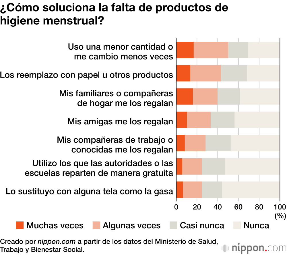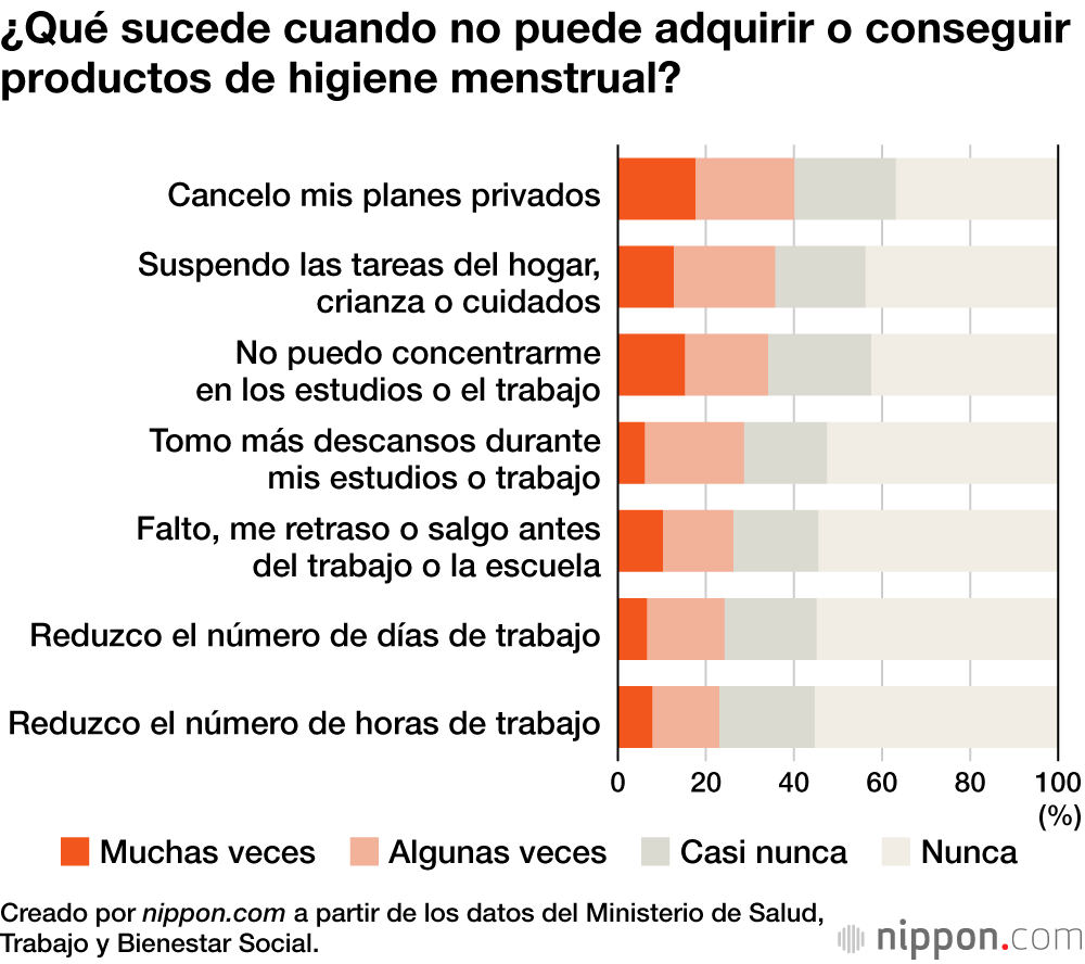 En febrero de 2022, el Ministerio de Salud, Trabajo y Bienestar de Japón llevó a cabo la primera encuesta sobre pobreza menstrual, es decir, la escasez de recursos económicos para adquirir productos de higiene menstrual. Se les preguntó a tres mil mujeres de entre 18 y 49 años de todo el país sobre cómo obtienen sus productos de higiene menstrual desde el comienzo de la pandemia del nuevo coronavirus.
