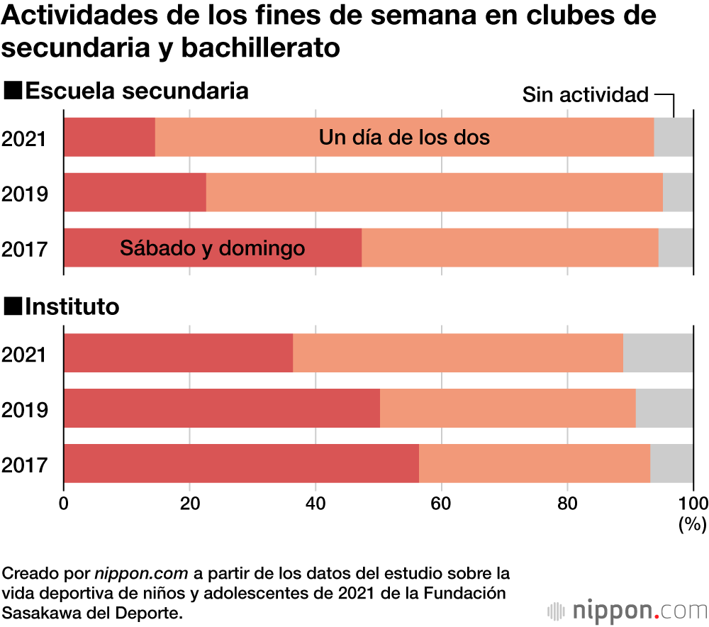 Las actividades de fin de semana en los clubes deportivos también están a la baja. En 2017, el 48,4 % de los estudiantes de secundaria y el 56,4 % de los de instituto tenían actividades tanto los sábados como los domingos, pero en 2021 el porcentaje disminuyó al 14,5 % entre los primeros y al 36,4 % entre los segundos.