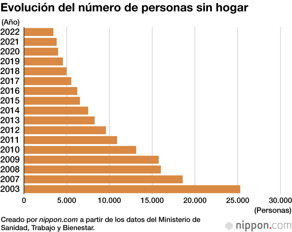 Según una encuesta que el Ministerio de Sanidad, Trabajo y Bienestar viene realizando desde 2003, en enero de 2022 el número de personas sin hogar en todo el país era de 3.448, lo que supone un descenso de 376 (9,8 %) respecto al año anterior. Se trata de la cifra más baja registrada en este estudio hasta la fecha. De ellos, 3.187 eran hombres, una abrumadora mayoría, mientras que 162 eran mujeres y 99 eran personas cuyo sexo no pudo confirmarse visualmente debido a que llevaban ropa de invierno u otras razones.