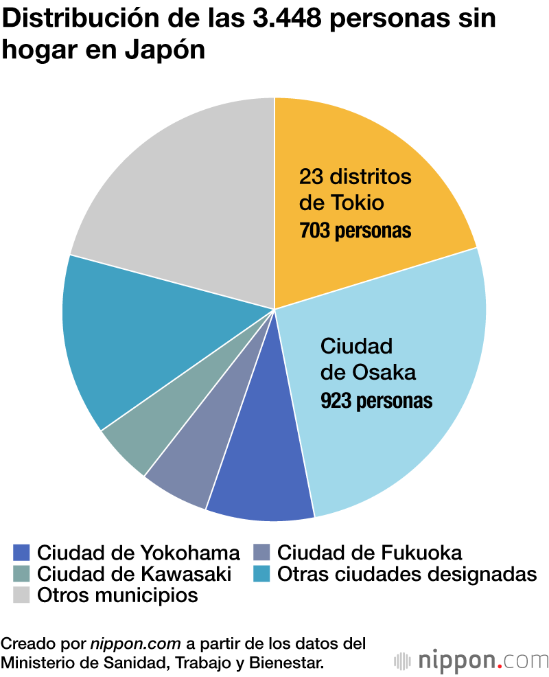 Por prefecturas, la de Osaka es la que cuenta con más personas sin hogar con 966, seguida de Tokio con 770 y la Kanagawa con 536. No se identificaron personas sin hogar en 12 prefecturas: Aomori, Iwate, Akita, Yamagata, Fukui, Nagano, Shiga, Nara, Tottori, Shimane, Yamaguchi y Nagasaki. Los mayores descensos interanuales se dieron en Kanagawa (-151) y Tokio (-92).