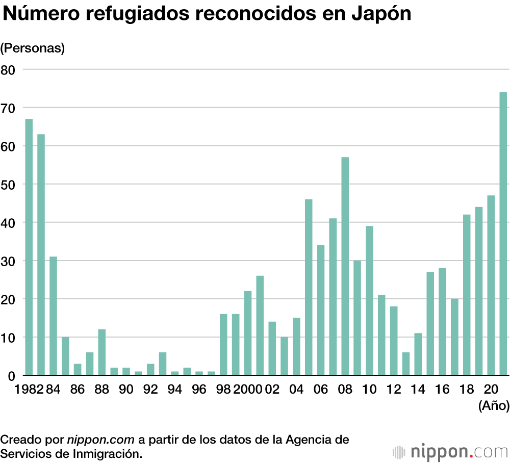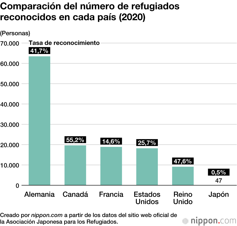 Según la ONG Asociación Japonesa para los Refugiados (con sede en Tokio), en 2020, Japón otorgo el estatus de refugiado a 47 personas y hubo una tasa de reconocimiento del 0,5 %, mientras que Alemania reconoció a 63.456 y registró una tasa de reconocimiento del 41,79 %, Canadá a 19.596 (tasa del 55,2 %) y Francia a 18.177 (tasa del 14,6 %). Destaca la baja cifra de Japón en comparación con los países de Occidente.